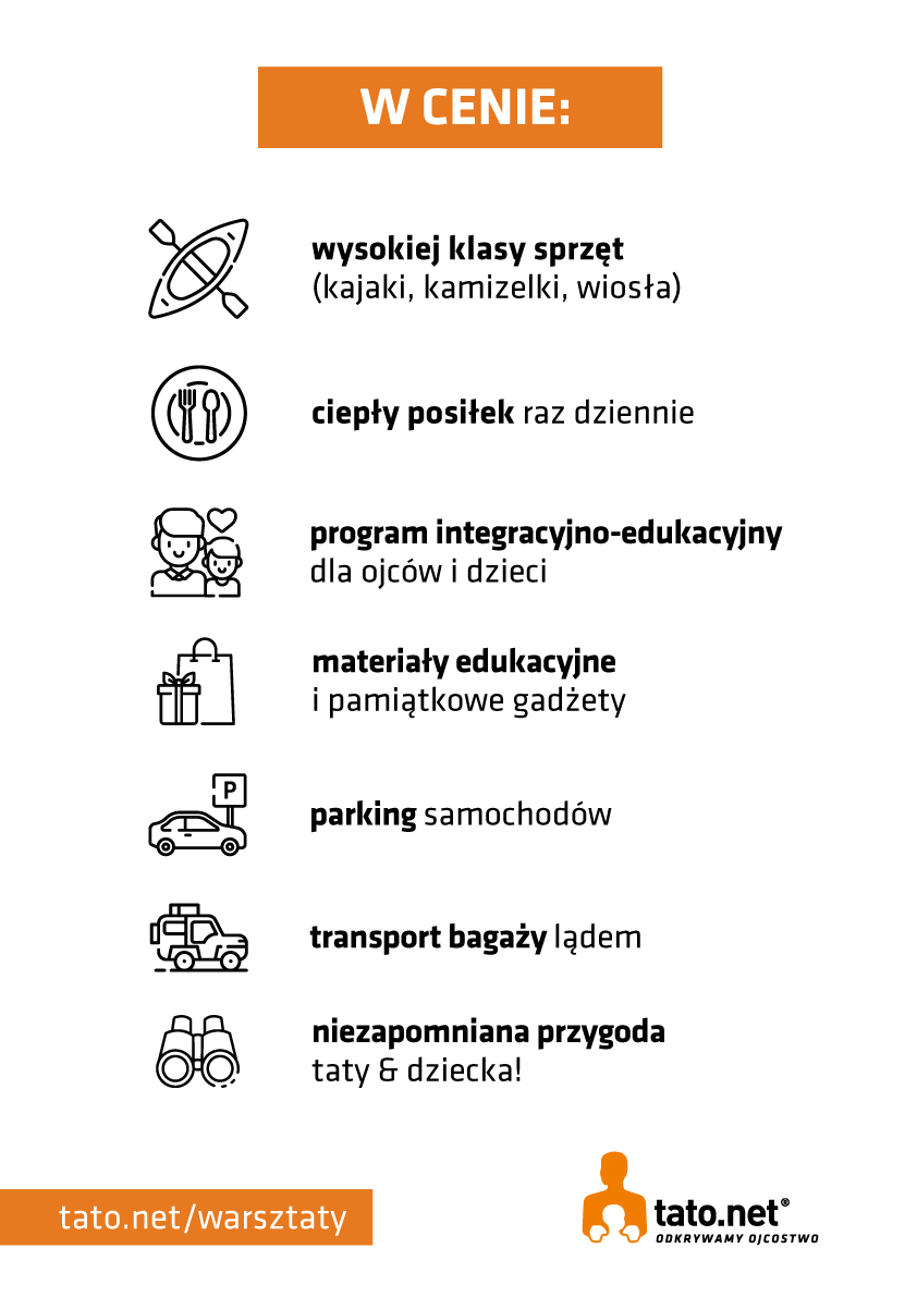 Udział w spływie kajakowym organizowanym przez Tato.Net to nie tylko aktywny wypoczynek, ale także mini survivalowa wyprawa dla ojców z dziećmi. To czas, w którym można porozmawiać bez pośpiechu, w odcięciu od codziennych obowiązków, od szkoły i pracy. To czas ograniczenia do minimum kontaktu z cywilizacją, budowania relacji między dzieckiem i ojcem przez trud, wysiłek fizyczny, aktywny wypoczynek i wspólnie podejmowanie nowych zadań. To wiosłowanie, wodowanie, rozbijanie namiotu, warty, posiłki na trawie i przy ognisku.