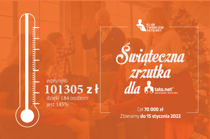 Dołącz do TOP500 ochotników, którzy od 5zł dziennie zasilają misję Tato.Net (cykliczna zrzutka od zlecenia w kwocie 150 zł/msc). Możesz być też częścią Klubu Twórców Tato.Net zabezpieczając cyklicznie 50zł/msc. Twoje zaangażowanie zabezpieczy osiągnięcie celów strategicznych Tato.Net oraz dokonanie zmiany społecznej. Wspierasz tyle, ile możesz. Dziękujemy za każdą wpłatę.